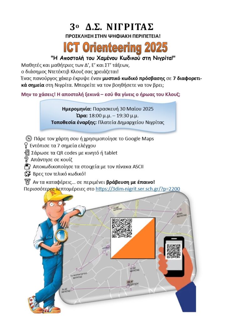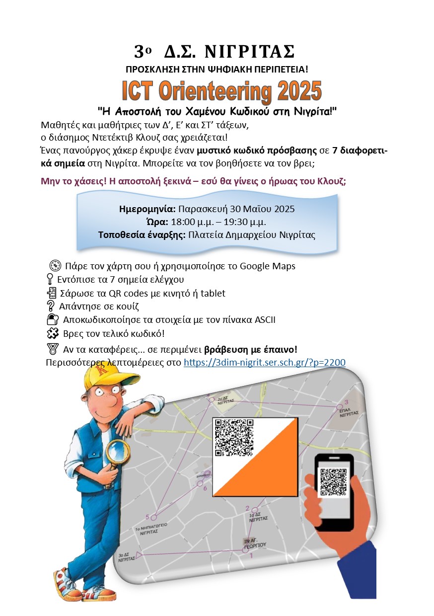 Στα πλαίσια της Παγκόσμιας Ημέρας Προσανατολισμού (World Orienteering Day-WOD https://worldorienteeringday.com/ ), οι μαθητές/τριες των Δ, Ε και ΣΤ τάξεων του 3ου Δ.Σ. Νιγρίτας καλούνται να συμμετάσχουν, σε ώρες εκτός σχολείου-από την Τρίτη 27/5 έως την και την Πέμπτη 29/5/2025-και με ευθύνη των γονέων/κηδεμόνων, στην δράση ICT ORIENTEERING 2025 του 3ου Δ.Σ. Νιγρίτας.